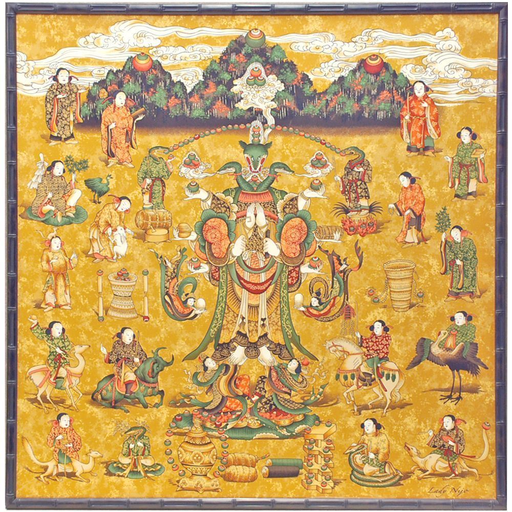 弁財天曼荼羅と名づけられたスカーフの額装。非常に特徴的な絵柄が目を引きます。