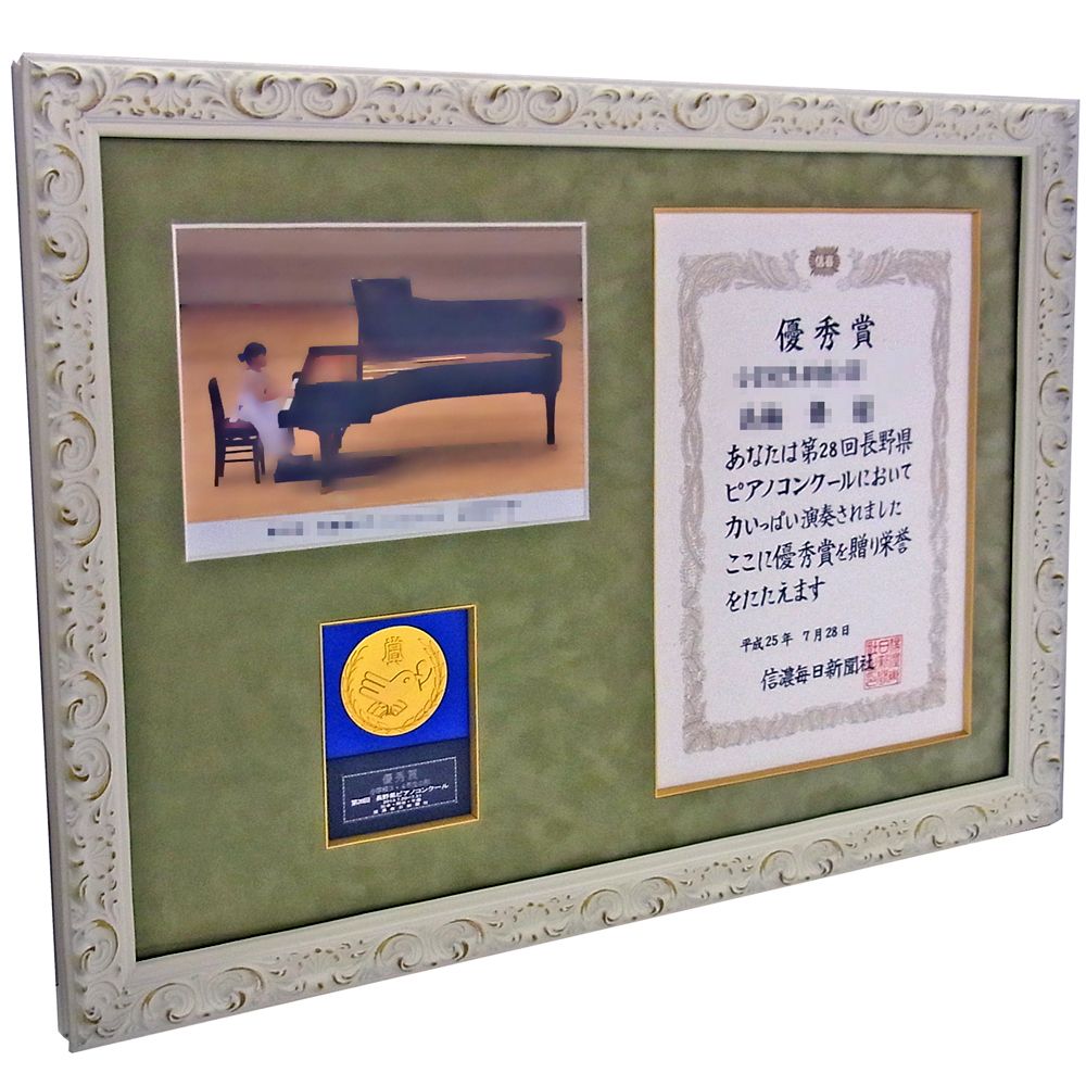 ピアノ発表会の表彰状と、メダル、写真をまとめて額装しました。アンティークホワイトのフレームに、スウェード調のマットを合わせて、上品で高級感のある仕上がり。