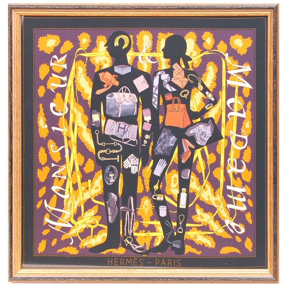 エルメス2013年の秋冬コレクション、ムッシュー&マダム(Monsieur et Madame)です。ハンカチサイズのミニスカーフ、豹柄の背景に男女のシルエット、影の上にはエルメスを象徴するアイテムが散りばめられた斬新なデザインです。