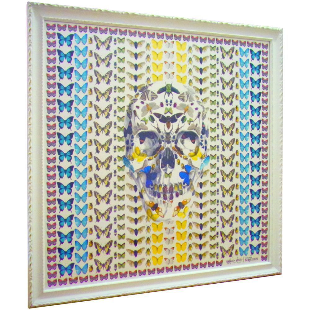 Alexander McQueen(アレキサンダー・マックイーン)のスカーフ。髑髏に蝶が乱舞するデザインとは裏腹に、カラフルな色使いが映える品物です。 明るい色合いが際立つよう、シックなホワイトフレームを採用しました。スカーフのデザインの邪魔にならず、ナチュラルに引き立てる額装に仕上がっています。フレームがかなり太めであることも、全体のバランスを保つのに一役買っているように思えます。 アレキサンダー・マックイーンのスカーフ(ストール)はこちらの90cm程度のサイズ以外に、1mを超える大サイズの展開もあるようです。大きなサイズのスカーフ額装もぽつぽつと承っておりますが、ご自宅に飾るサイズとしては90cmでもかなりの迫力になります。