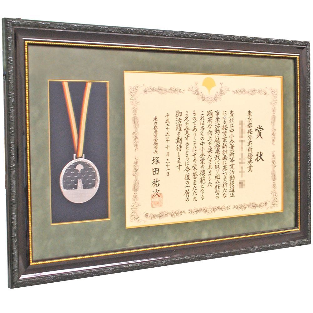 東京都産業労働局が新事業に積極・果敢に取り組み、経営の顕著な向上を果たした企業を表彰するのが『東京都経営革新優秀賞』です。大賞サイズの賞状と、東京都の伝統工芸技術で作られたメダルを額縁に入れました。