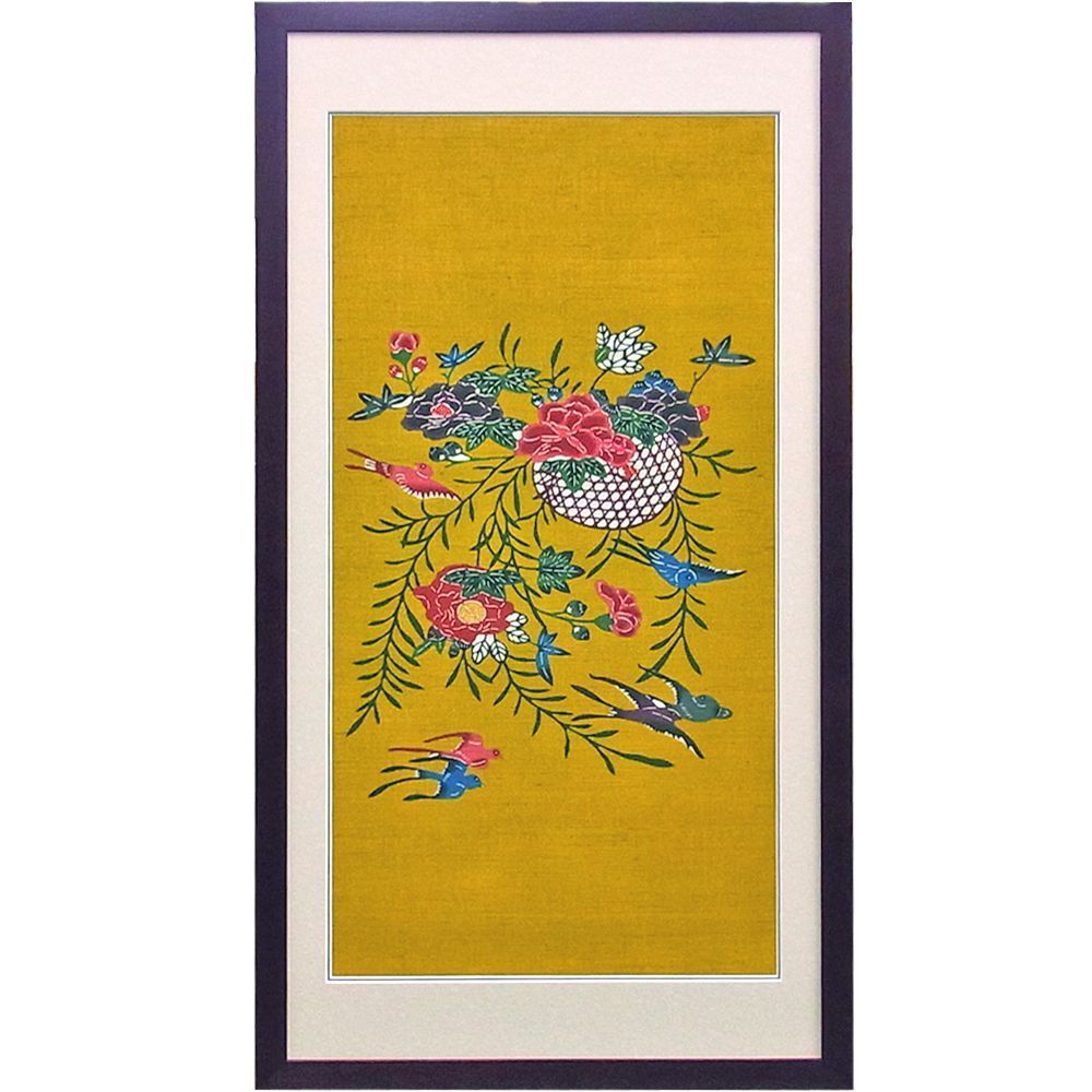 13世紀頃からの古い歴史を持つ沖縄伝統染色、紅型(びんがた)のタペストリーです。びんがたは沖縄の地理的要素のおかげか、あらゆる東洋文化の影響を受けて独自の進化を遂げてきました。他国の美意識を取り入れながら、それをミックスして昇華したびんがたは、献上品としても高い評価を得ていたようです。