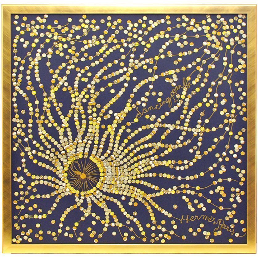 「son ceng pearly」(散りばめられたパール)と名前が付けられたエルメススカーフの額装。漆黒の中に散りばめられたパールが浮かぶ芸術性に優れた品物です。地の黒が美しく映えているのもエルメスならでは。無数の擦り傷模様が入った、つや消しゴールドのフレームを合わせました。