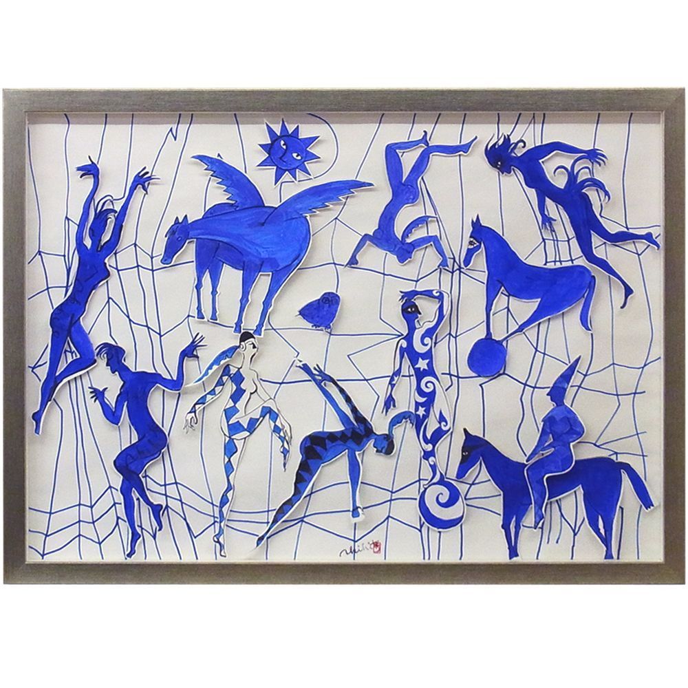 切絵を所狭しとレイアウトした作品。切絵が二次元的に自由に配置されていますが、三次元的にも若干浮き出ているのがポイントです。浮き上がりは1cm程度とほんの少しですが、ぺたっと平坦に貼り付けられてしまうのとは見た目の印象が全く違います。