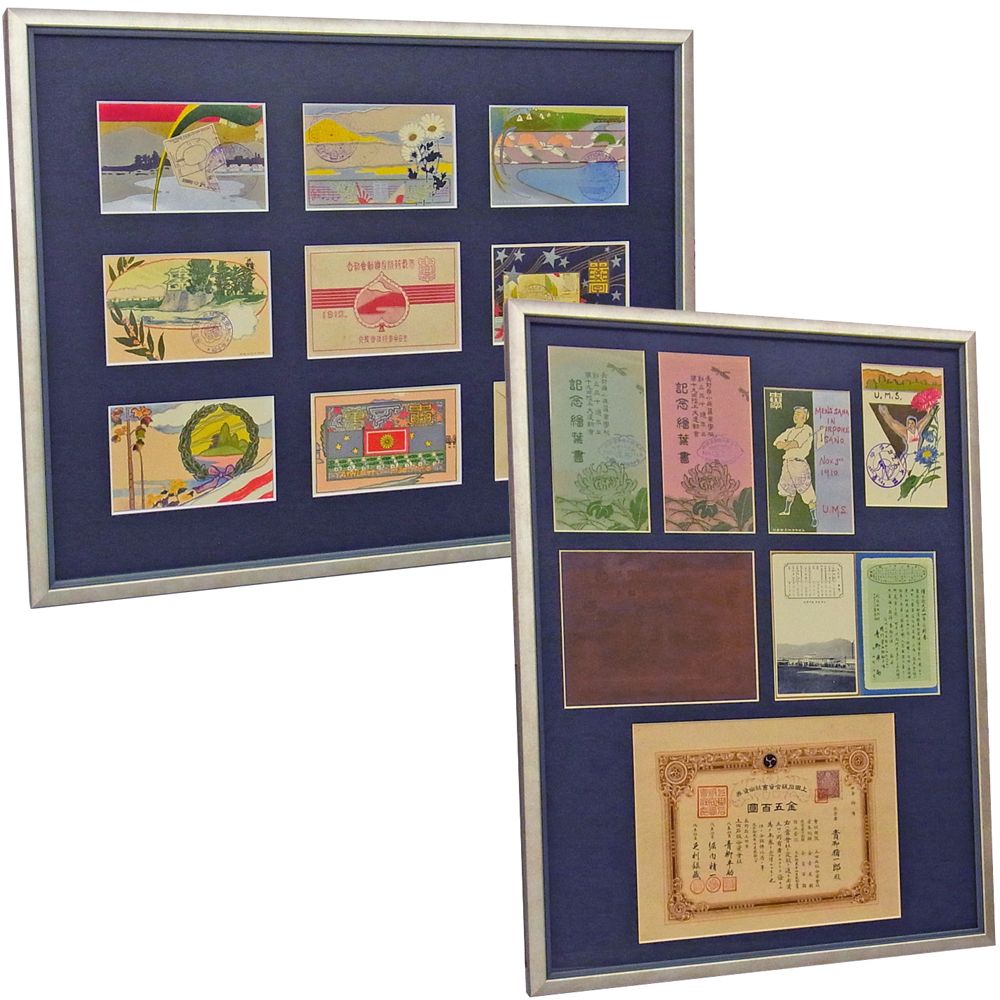 品物のレイアウト次第で、額縁の大きさをコントロールすることが可能です。一般額の規格サイズに合わせれば、安価に仕上げることができるでしょう。