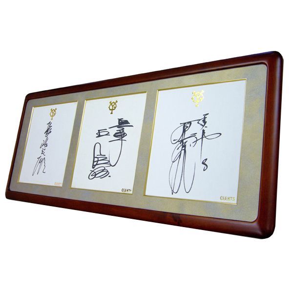 王貞治、長嶋茂雄、原辰徳のサインを1枚の額縁にまとめて飾りました。一般額に複数窓抜きしたマットを合わせています。規格サイズの【手ぬぐい/340×890】に、バランス良く納まりました。