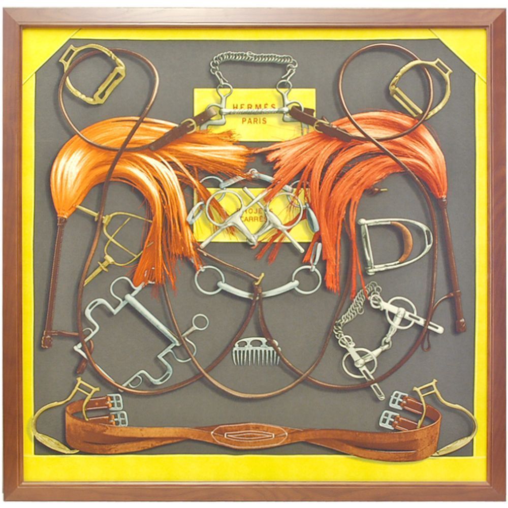 PROJETS CARRES (計画力)と名付けられたエルメスのスカーフ。標準的な約90cmの大きさで、スカーフのテーマも王道の「馬具」をモチーフにした品物です。使用したフレームは