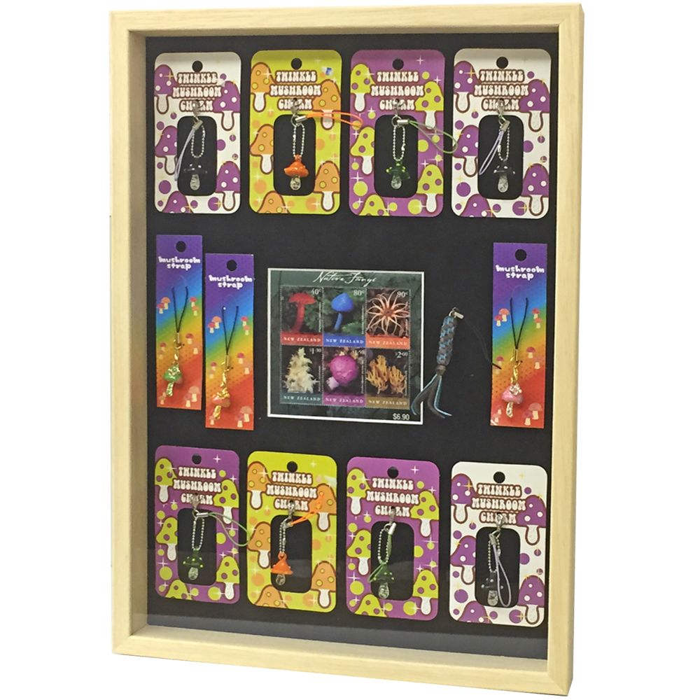 既製の立体額を使えば、額縁の価格もリーズナブル。品物の配置に悩むのも醍醐味の一つです。こちらの額装例では中央にスペースを作って、切手のシートも一緒に飾りました。立体物のストラップと平面の切手シートが同じ額縁に納まることで、立体感と奥行きが強調された仕上がりになります。