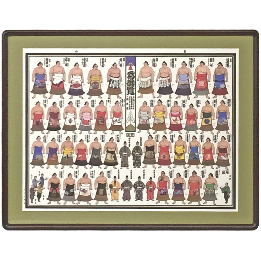 特徴をうまく捉えて描かれた、絵番付を額縁に入れました。番付というと、太い文字がぎゅうぎゅうに書かれたいわゆる番付表を思い出しますが、イラストの番付もなかなか楽しげで見入ってしまいます。いまひとつ四股名と顔が一致しない相撲ファンも、この番付なら一目瞭然。