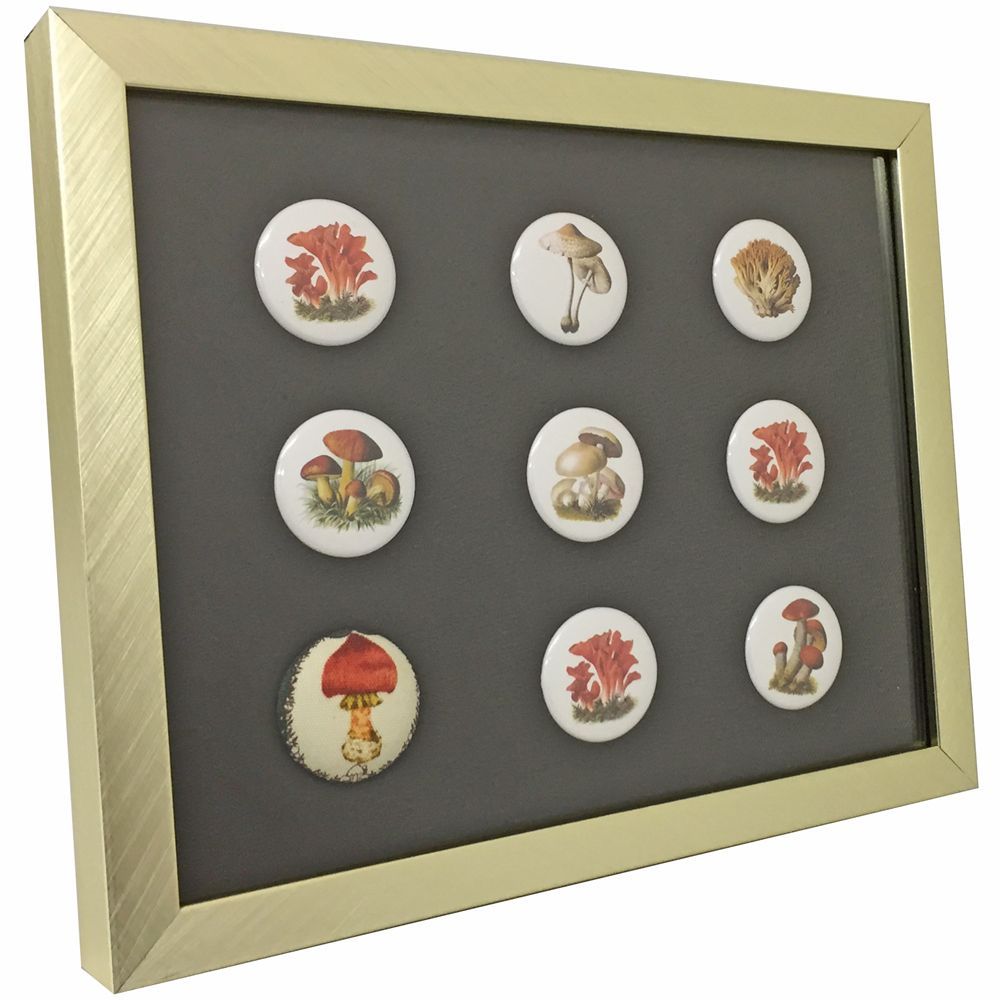 缶バッジを一まとめにして額縁に入れました。こういった小物の額装にぴったりなのが