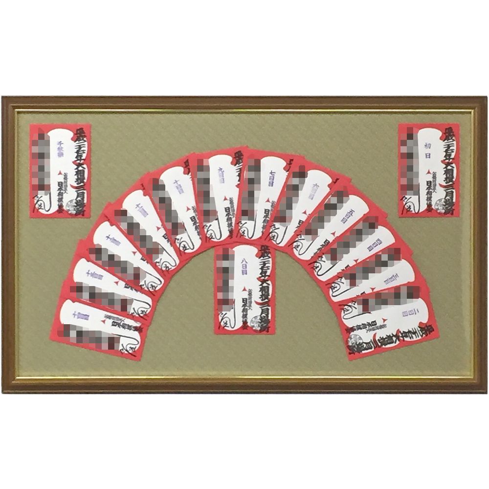 大相撲の大入袋を額装しました。勉強不足でお客様にお教えいただいたのですが、大入袋の配置の仕方がポイント。横綱が露払いと太刀持ちを従えて、土俵入りしている様を表しているそうです。初日は右上、千秋楽は左上、八日目が中央と、細かく配置が決まっています。初日から千秋楽まで、15日間の全てが揃っていないとできない額装でもあります。