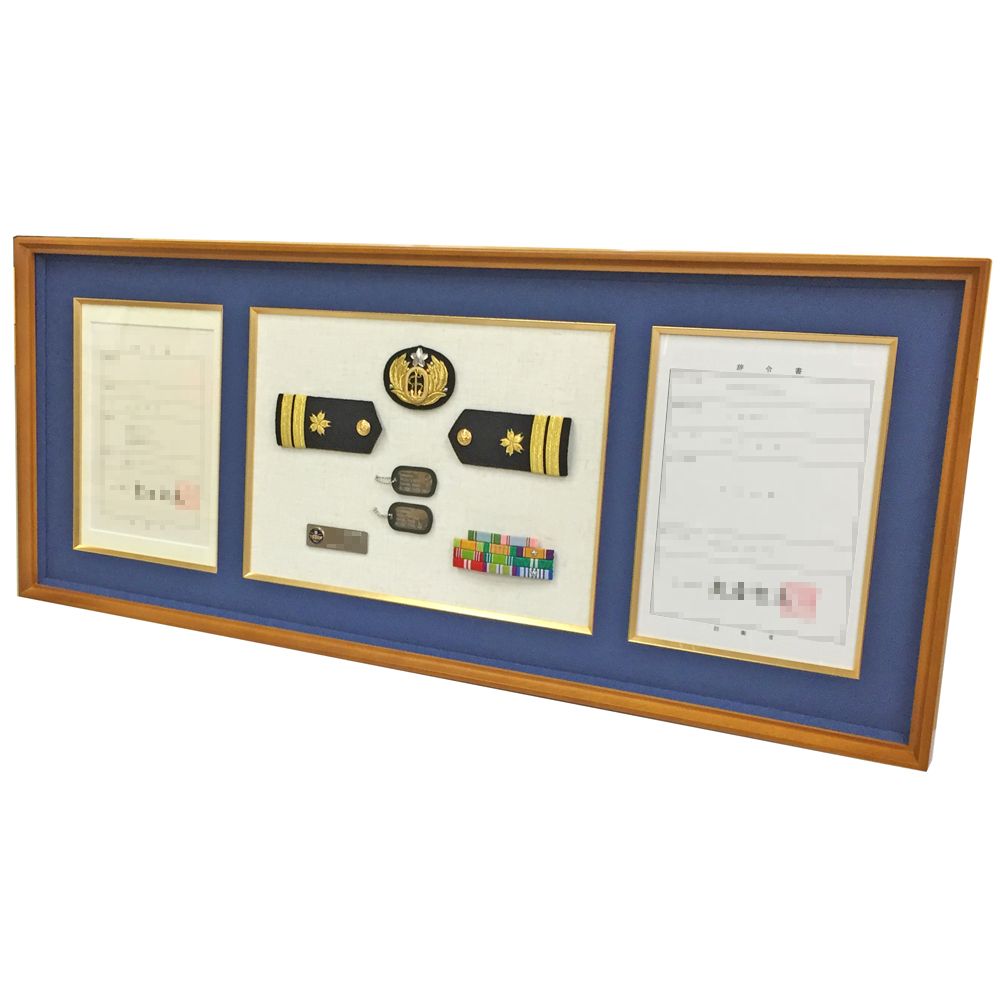 帽章や階級章、名札、防衛記念章など、退職にあたって想い出の品物を額縁にまとめました。「海上自衛隊 感謝の辞」とセットでのご注文です。