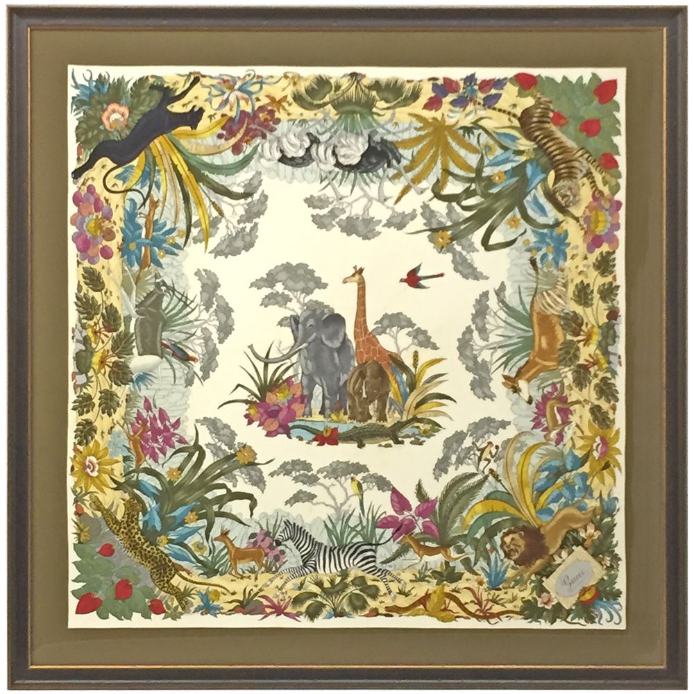 グッチのアニマル柄のスカーフ。2010年頃に発表されたデザインのようですが、非常に多くの種類の動物が描かれた、デザイン性に富んだスカーフです。