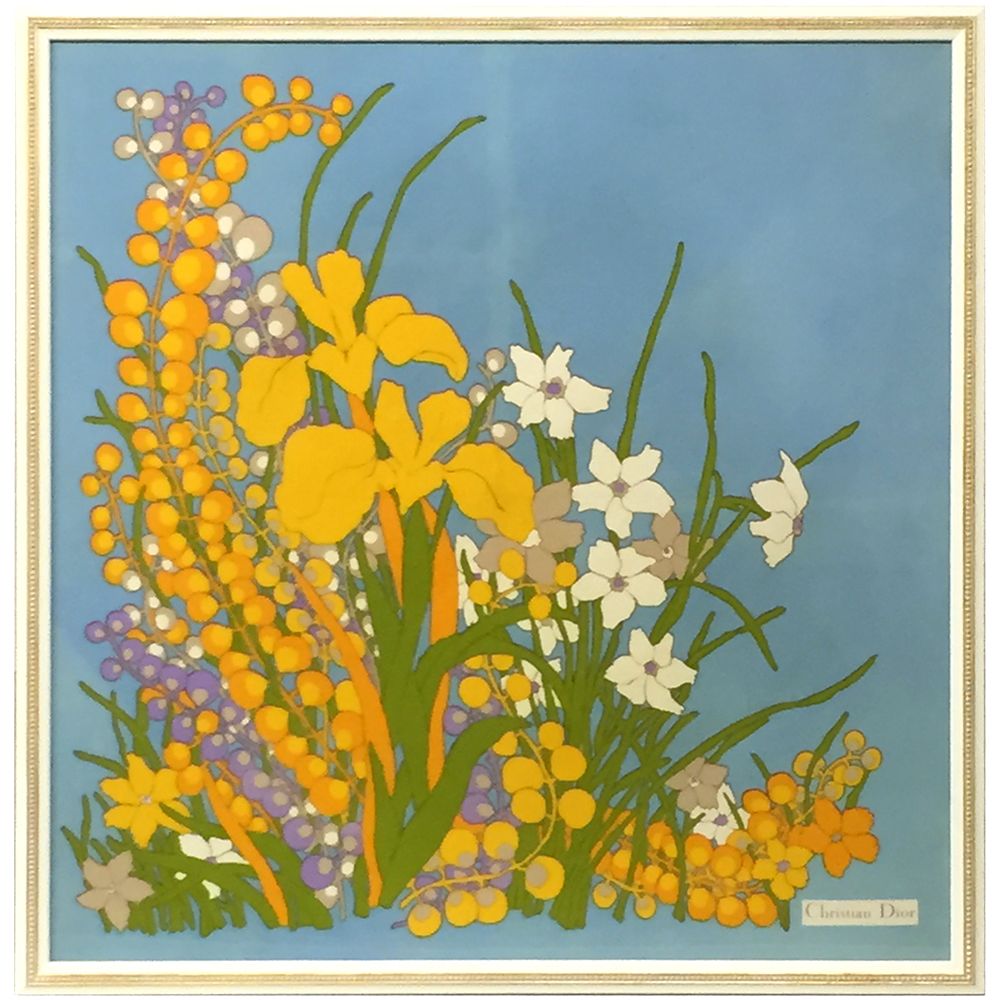 クリスチャン・ディオールのスカーフ。水色の地に黄色のお花が大胆に描かれたスカーフです。フレームはスカーフ額として好評の、A-20156を使いました。白を基調とするフレームで合わせ易く、フレームトップに入った宝石調の縁飾りが良いアクセントになります。