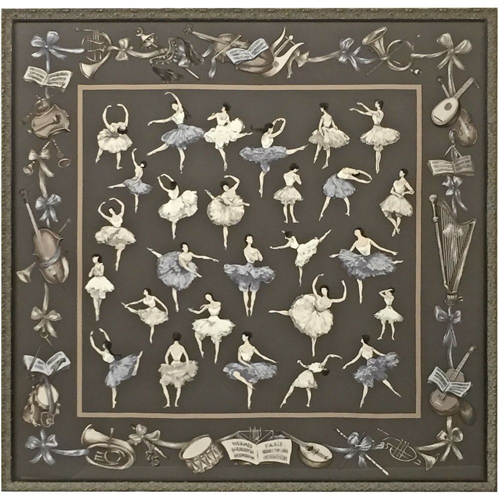 エルメスのラ・ダンス。バレリーナをモチーフにしたスカーフです。エルメスのスカーフはデザインにより多くのカラーバリエーションがありますが、こちらのラ・ダンスはモノトーンの落ち着いた色合い。派手さはありませんが、微妙な濃淡の違いによるリアルな表現が見事です。