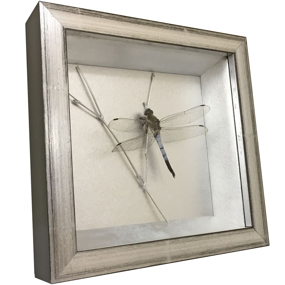オオシオカラトンボの昆虫標本です。深さを確保した額縁の中にトンボの止まり木を固定して、今にも飛び立ちそうなトンボを再現しました。フレームも額縁の内部もシルバーで統一して、オオシオカラトンボのブルーが良く映える額装に仕上がっています。