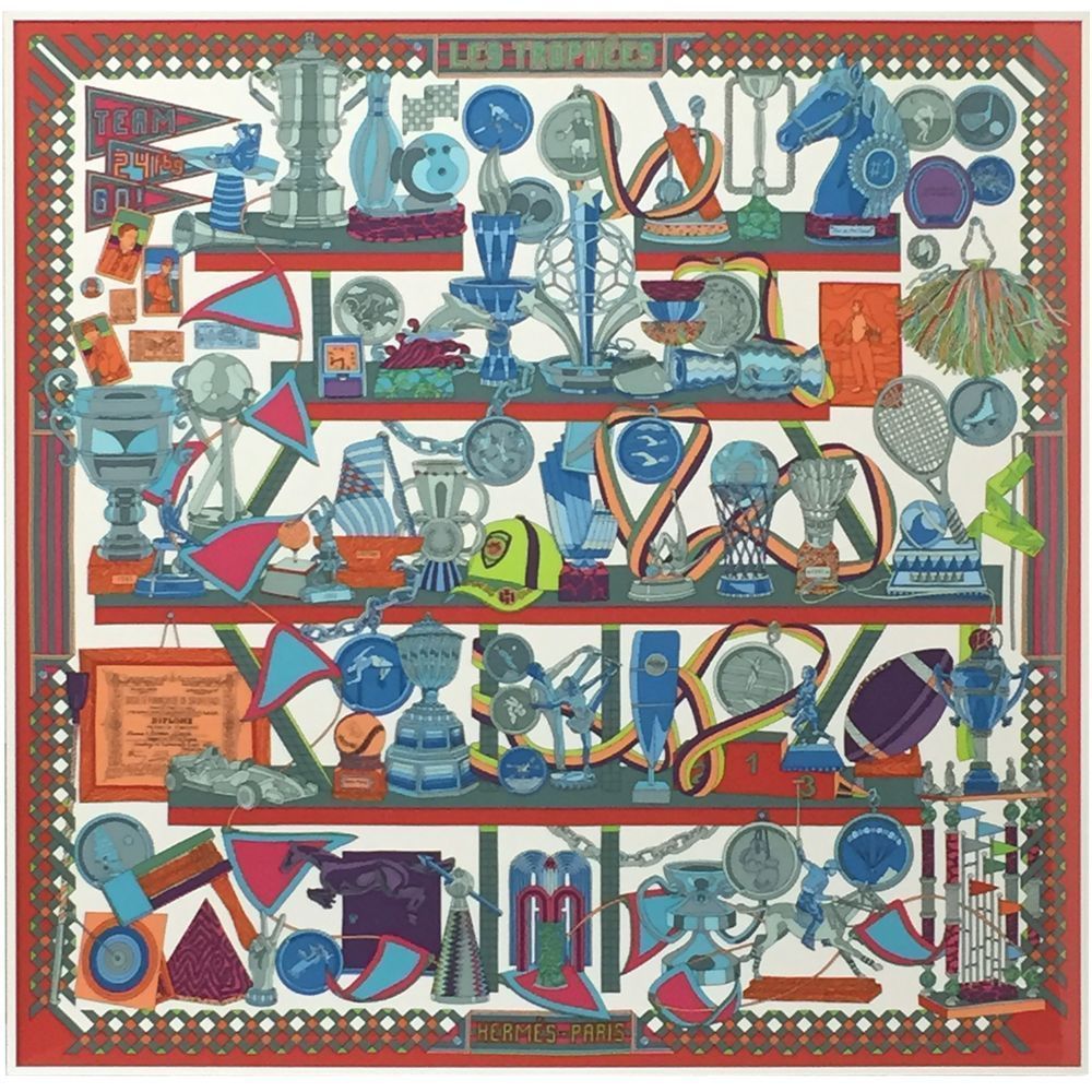 エルメス・カレのトロフィー(Les Trophees)の額装。エルメススカーフの表現力を証明するような、多数の品物が所狭しと描かれています。