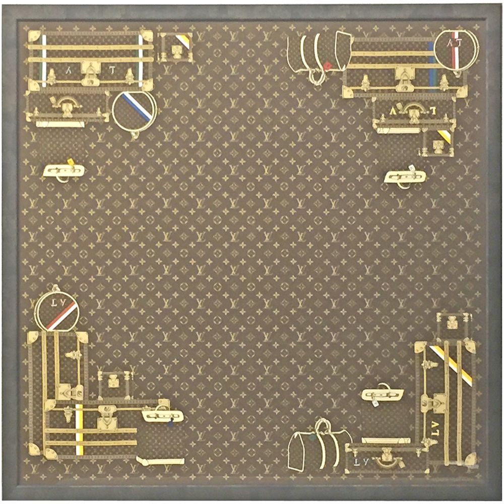 まさにルイヴィトンといったデザインのスカーフです。ヴィトンといえばモノグラム。モノグラムに加え、ヴィトンの代表的アイテム、トランクも描かれています。アルミ製、ざらざらした質感が特徴のフレームで額装しました。いぶし調の重厚な色合いで、伝統あるルイヴィトンにはぴったりです。