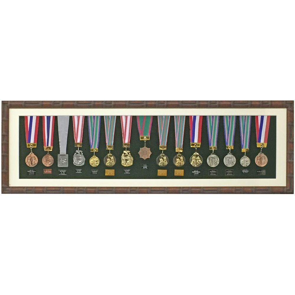 剣道大会のメダルを一堂にまとめて飾りました。その数は15個。長年にわたる努力の結晶です。剣道のイメージに合わせて、竹をモチーフにしたフレームを選択しました。メダル裏面の大会名を記したプレートを外し、メダルの下に配置しています。メダル裏面のプレートは是非見えるところに飾りたいアイテムですが、強力に貼り付けられて外せない場合もあります。