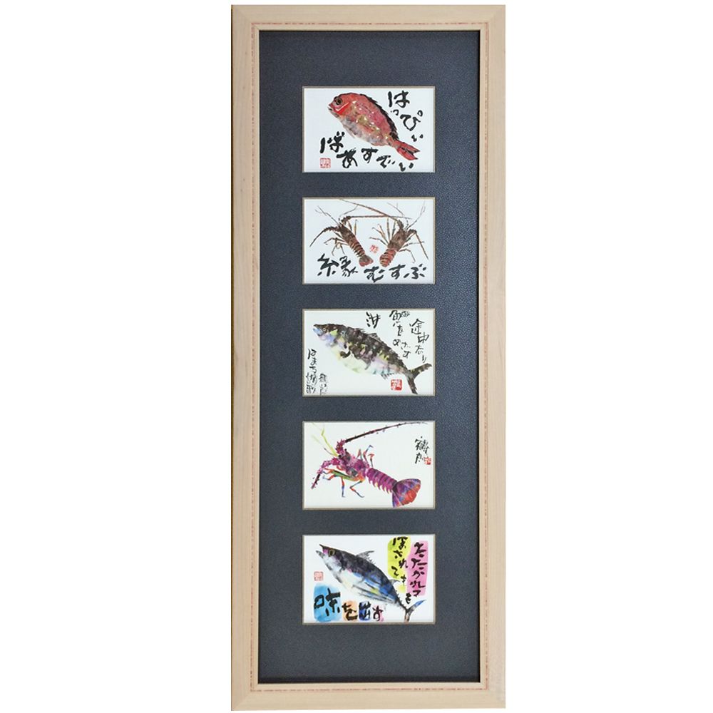 片岡鶴太郎のハガキ絵。アジやヒラメなどを身近な題材を、自由に描いた作品は高い評価を得ています。5点まとめて飾りました。NHKの鶴太郎流墨彩画塾で、鶴太郎流の描き方を学んだ方も多いでしょう。