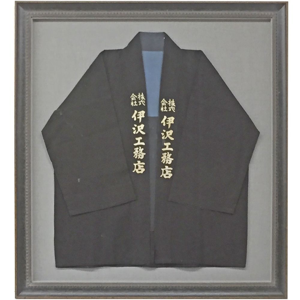 年季の入った工務店のハッピです。立体額に塩ビ製の人型ハンガーを組み合わせて額装しました。かなり古びた品物ですが、こういった歴史を感じられる品物は、なかなか捨てられるものではありません。かといって、たんすの肥やしにしたままでもしょうがないので、インテリアとして活用することをお考えください。飾ってみると、思い出深い良いインテリアになります。