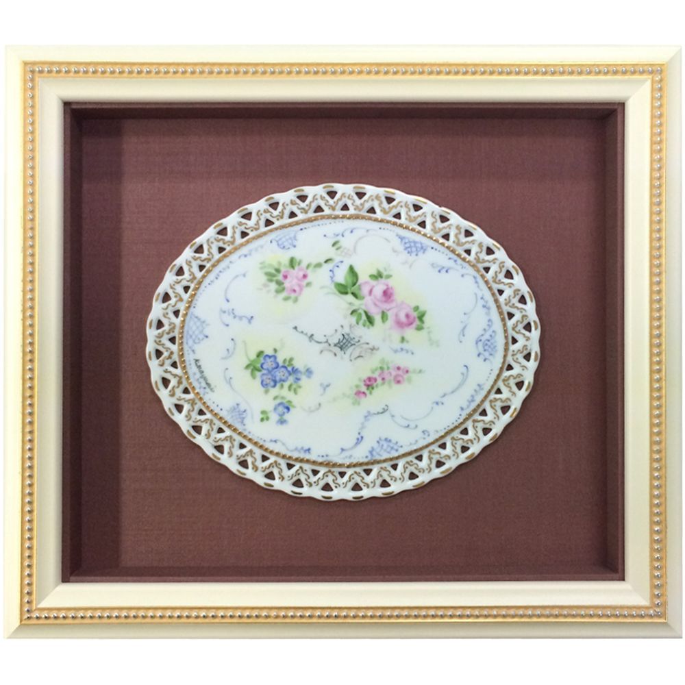 透かしの入った楕円形の陶板です。立体額の中央に固定して額装しました。
