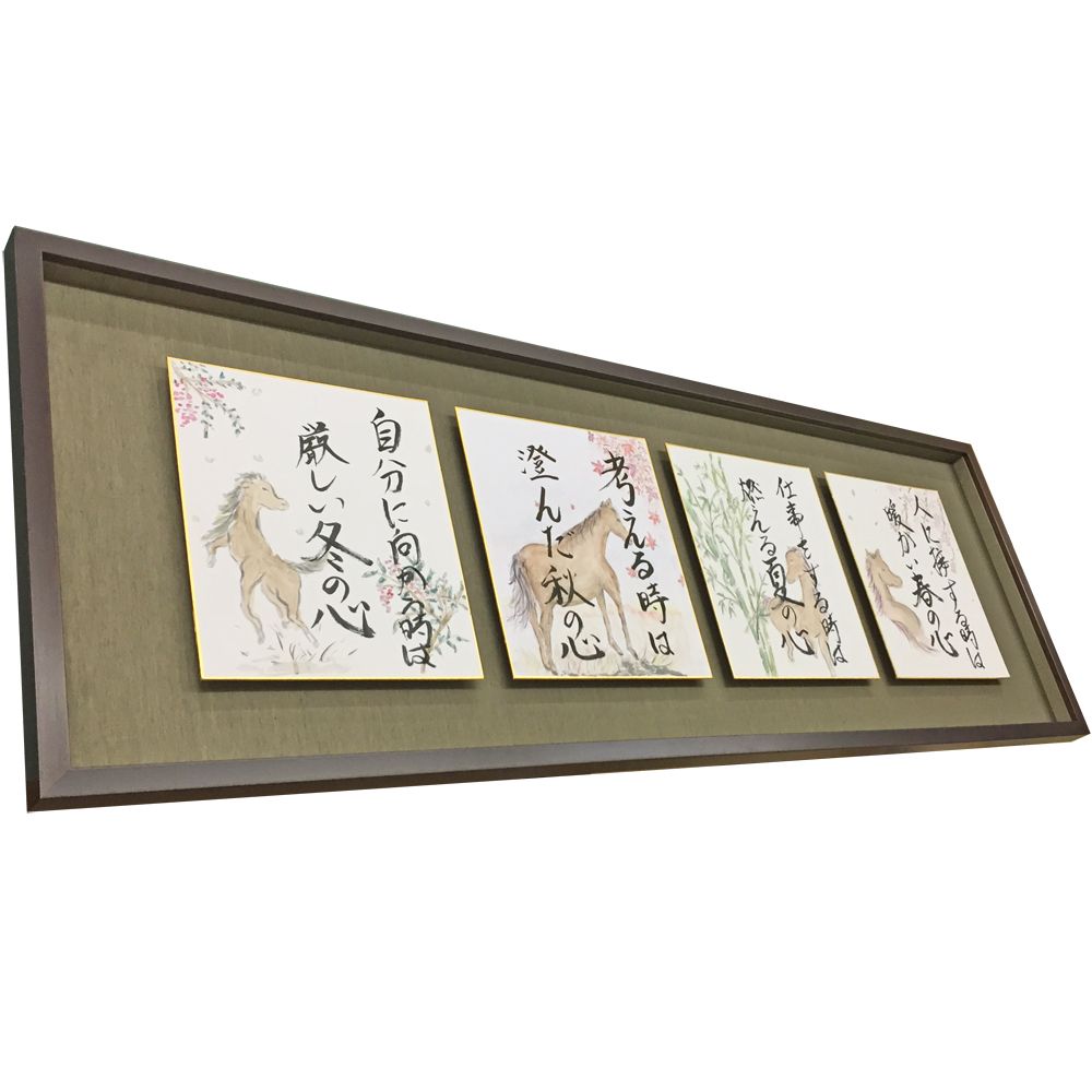 春夏秋冬をテーマにした、色紙4枚をまとめて額装しました。額縁を4枚並べるのも良いですが、同じ額縁に入れて仕上げると圧巻です。1枚1枚は標準色紙(242×273)で小さいですが、並べると余裕で1mを超える仕上がりになります。