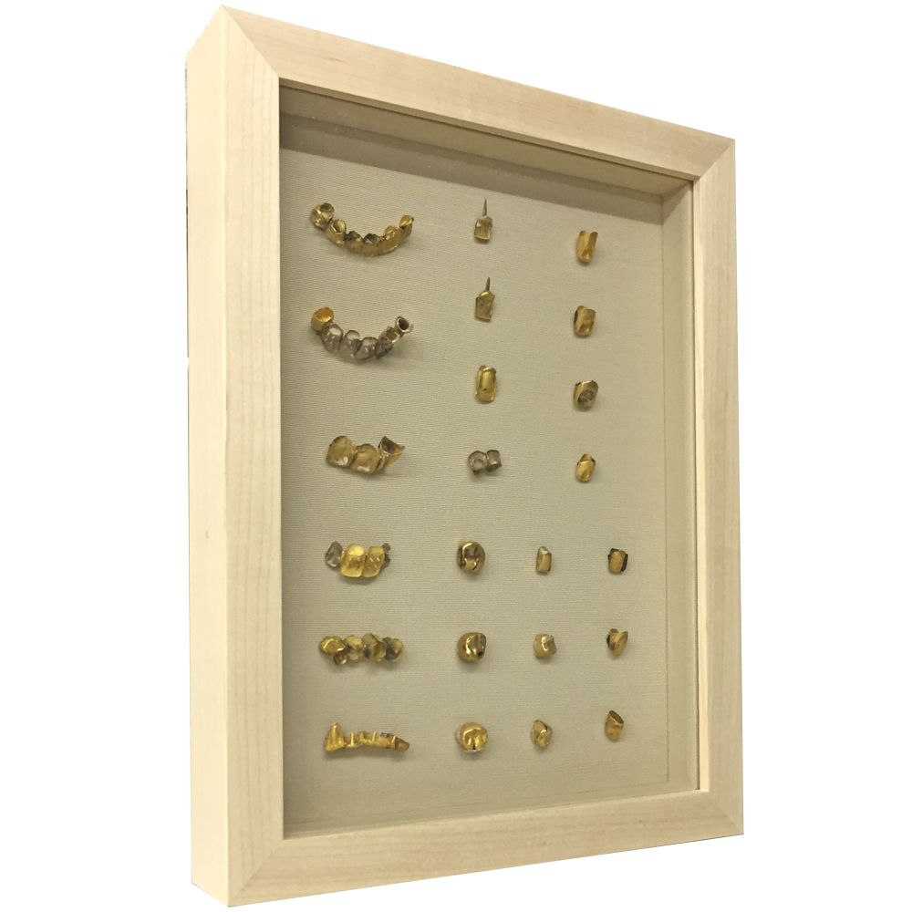 立体物の固定は、ボンドや両面テープ、針金や紐で縛る、裏板を通してネジ止めするといった方法を採ります。金へのダメージを考えると、ボンドや両面テープ、ネジ止めといった手法は却下、針金や紐で縛るのがベストです。ところが金歯は非常に小さく、形によっては縛るポイントがありません。固定方法を模索した結果、額縁背面に歯の代わりとなる土台を付け、金歯を被せて留めました。