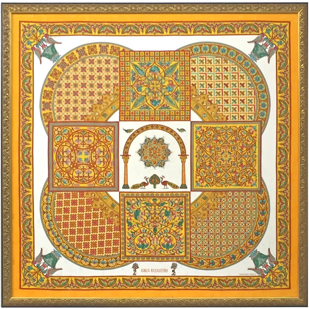 エルメスのカレ「CIELS BYZANTINS/ビサンチンの空」を額装しました。1997年春夏のモデルとして発表されたスカーフのようですが、今年2015年の春夏コレクションとして復刻販売されています。ジュリー・アバディによるデザイン。
