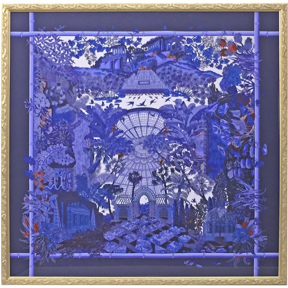 所々に赤系の色がありますが、ほぼブルー一色で統一されたスカーフ。シルバーとホワイトのフレームを候補とし、最終的にシルバーのフレームに決まりました。若干汚しの入ったシルバーのフレームが、豪華な庭園のイメージと良く合っています。