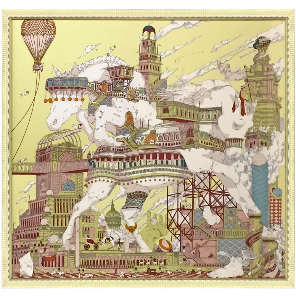 額装例#2824と同じく、Hippopolis(イポポリス)と名付けられたエルメススカーフの額装です。先の額装例は2色のみのシンプルな色使いのスカーフでしたが、こちらは鮮やかな彩色がされています。