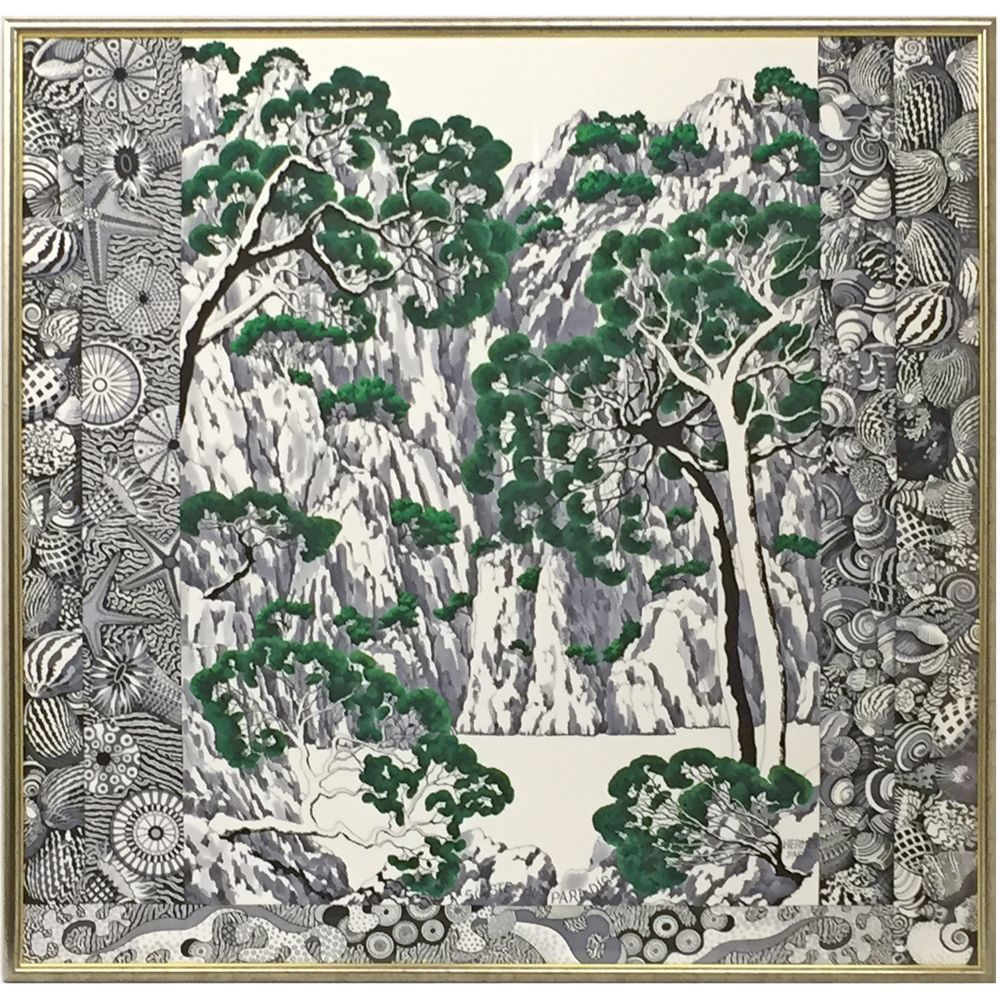 エルメスの2015年秋冬コレクション、アリーヌ・オノレがデザインしたカレ。外界から切り離された手付かずの入り江をモチーフにしたスカーフです。両脇に描かれた貝殻、珊瑚、ヒトデ、イソギンチャクなどが、和柄の垂れ幕のようにも見えます。岸壁に力強く生えるアレッポ松と相まって、和風のテイストが強く感じられます。