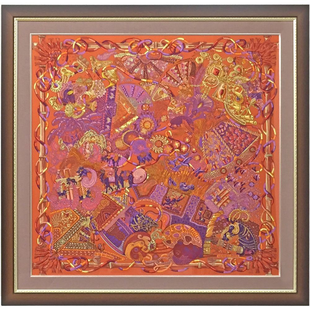 ベニヤ布貼りの特製マットを合わせたスカーフの額装です。紙マットの最大寸法の関係から、マット付きのスカーフ額装は一般的ではありませんが、特製マットなら90cmのスカーフにも充分対応できます。