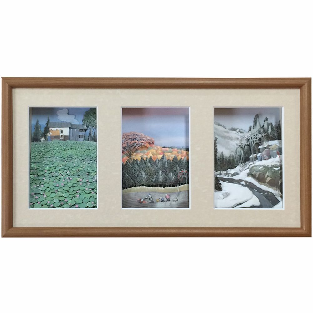 季節の移り変わりを再現したシャドーボックス。夏・秋・冬の3シーンが、1つの額縁の中に表現されました。