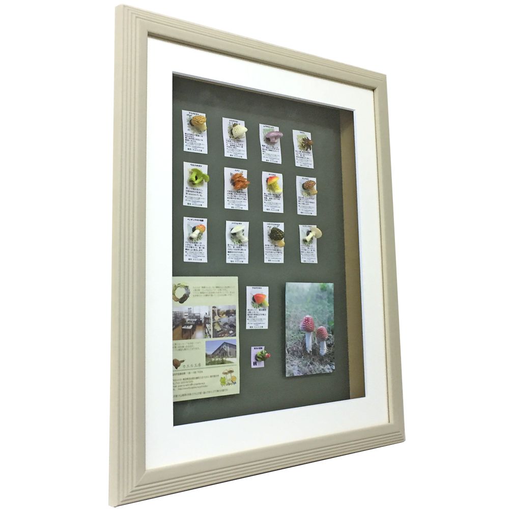立体スペーサーを使った額装例。可愛らしいきのこの模型を並べて飾りました。