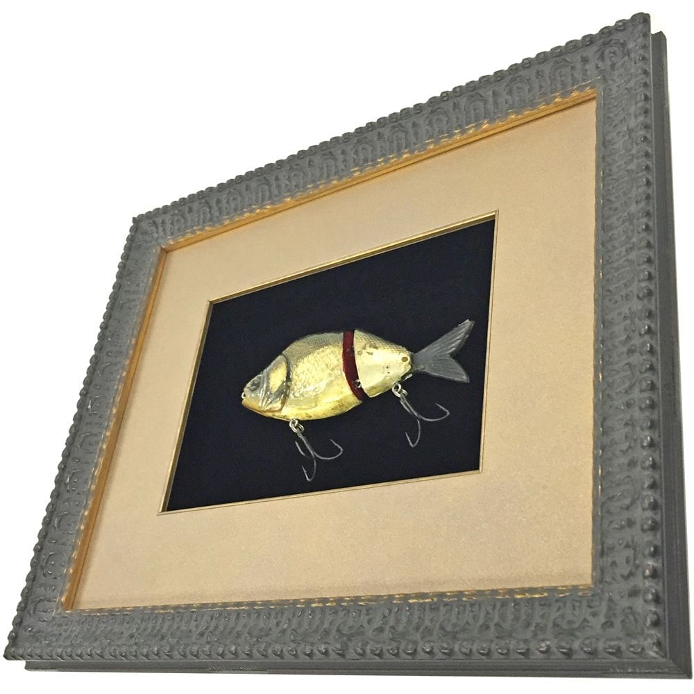 見事な作りの自作のルアー。実際に何度も使用した品物だそうですが、使わなくなったということで額縁に飾りました。リアルな光沢やフレキシブルに動く尻尾など、観賞価値の高い品物です。いかんせん釣りの経験が無いので詳細はわかりませんが、ルアーは星の数ほどの種類で出回っているようです。こういった自作品も含め、コレクションして飾ることも多いアイテムでしょう。