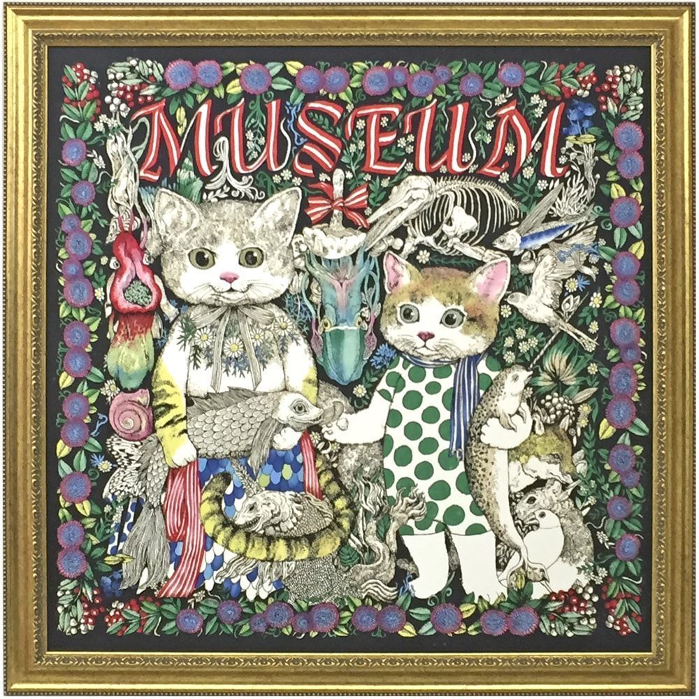ヒグチユウコさんの塗絵本、「Museum」をモチーフにしたスカーフの額装です。ヒグチユウコさん自身のブランド、Gustave(ギュスターヴ)で販売されているスカーフ。猫好きならずとも、繊細な描写と色使いに目を引かれてしまいます。フレームの豪華さとは対照的に、コストパフォーマンスに優れる「DG-9390/ゴールド」で額装しました。