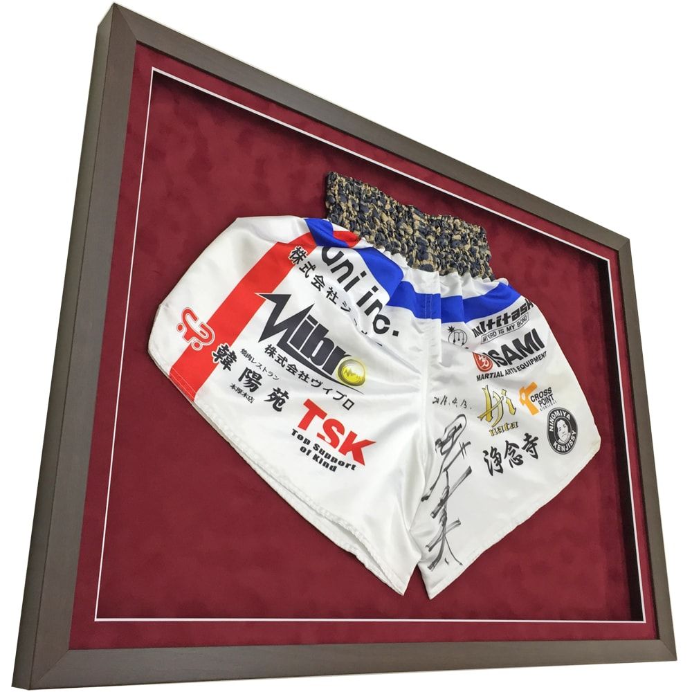 『ボクシングのトランクス 長谷川穂積選手』がありますが、ムエタイとボクシングでは、トランクスの形状が明らかに異なります。ムエタイのトランクスは足が自由に動くよう、股下が短めで広く作られていました。衣服を見やすく固定してみると、意外とサイズが違ってくることがままあります。固定済みの品物に合わせて、額縁のサイズバランスを決定するのが肝心です。