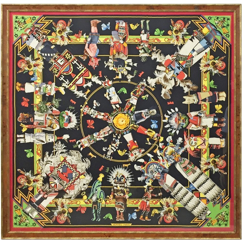 アメリカ・インディアンの部族のひとつである、ホピ族の守り神をモチーフにしたプリーツスカーフです。ホピとは彼らの言葉で「平和の民」という意味だそうで、守り神は「カチナ」と呼ばれます。デザイナーのカーミット・オリヴァーさんが、実際にホピに滞在して完成させたデザイン。賑やかで楽しげな、温かみのあるデザインに心が癒されます。
