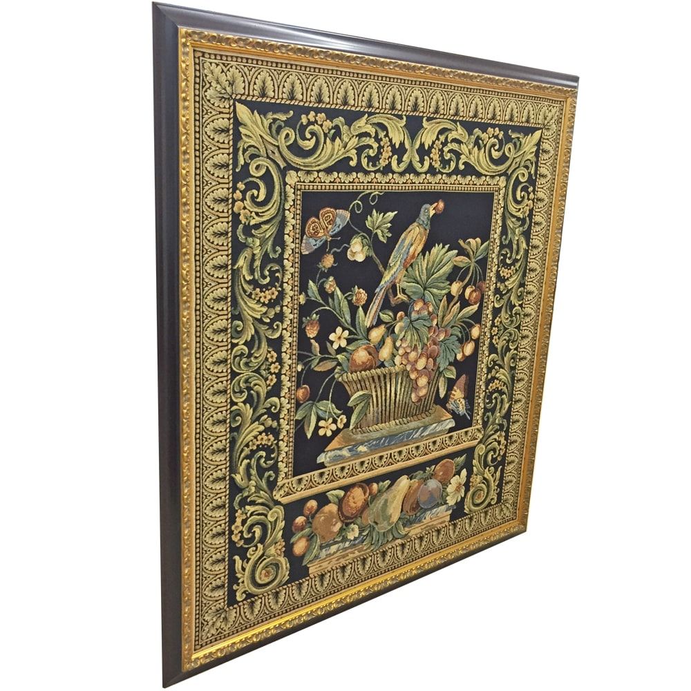 ゴブラン織りのタペストリー。伝統的な配色、模様や構図で描かれた由緒正しい品物です。ゴブラン織りはもともと壁面の装飾品として発達した歴史があります。布地そのままで飾るのもある意味正しいのですが、少し寂しく感じるかもしれません。伝統的な作風を活かす、重厚な額縁を付けて飾ってみましょう。