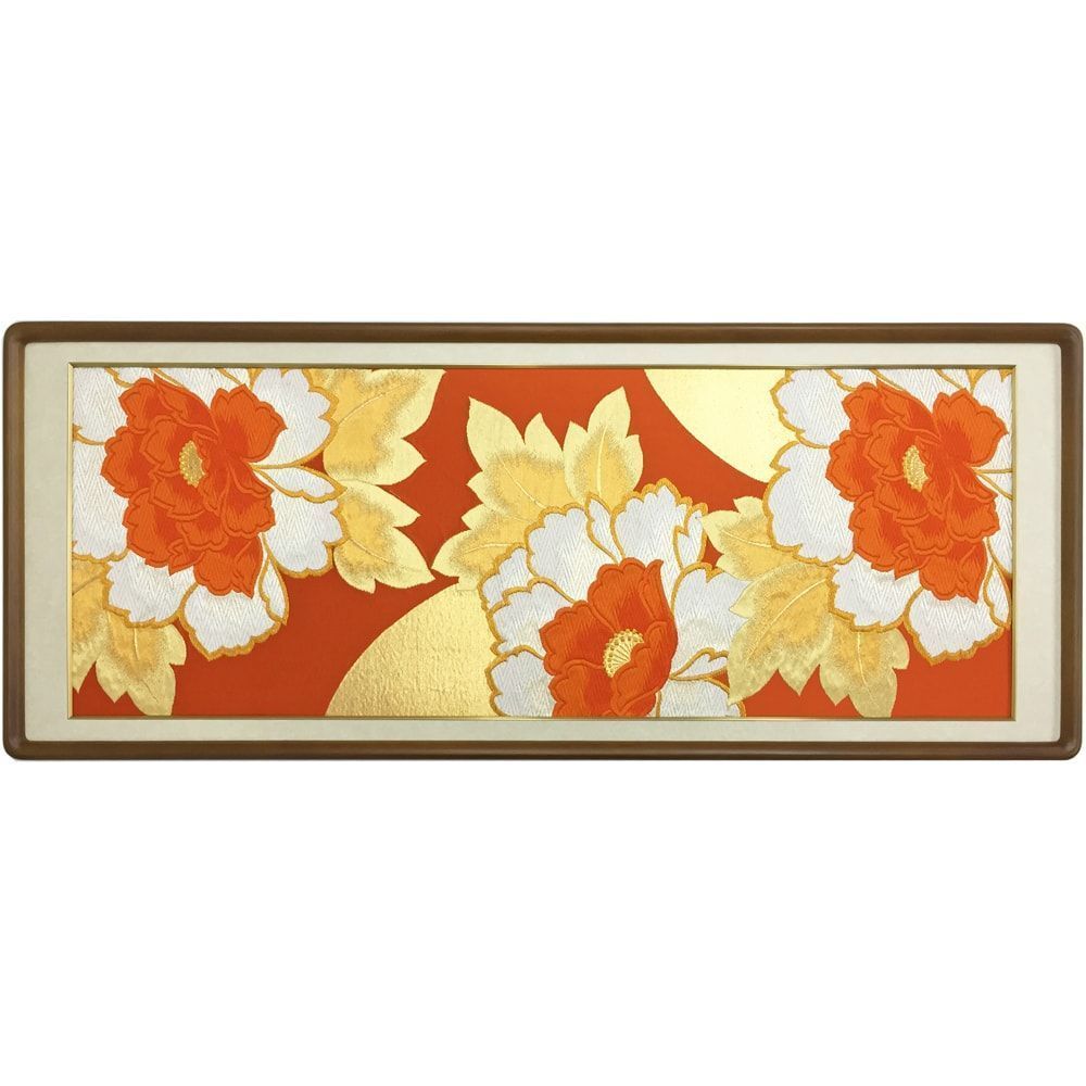 花柄の模様が連続して繰り返される着物の帯地。規格サイズの額縁に合わせて長さをカットし、面金付きのマットを組み合わせて額装しました。