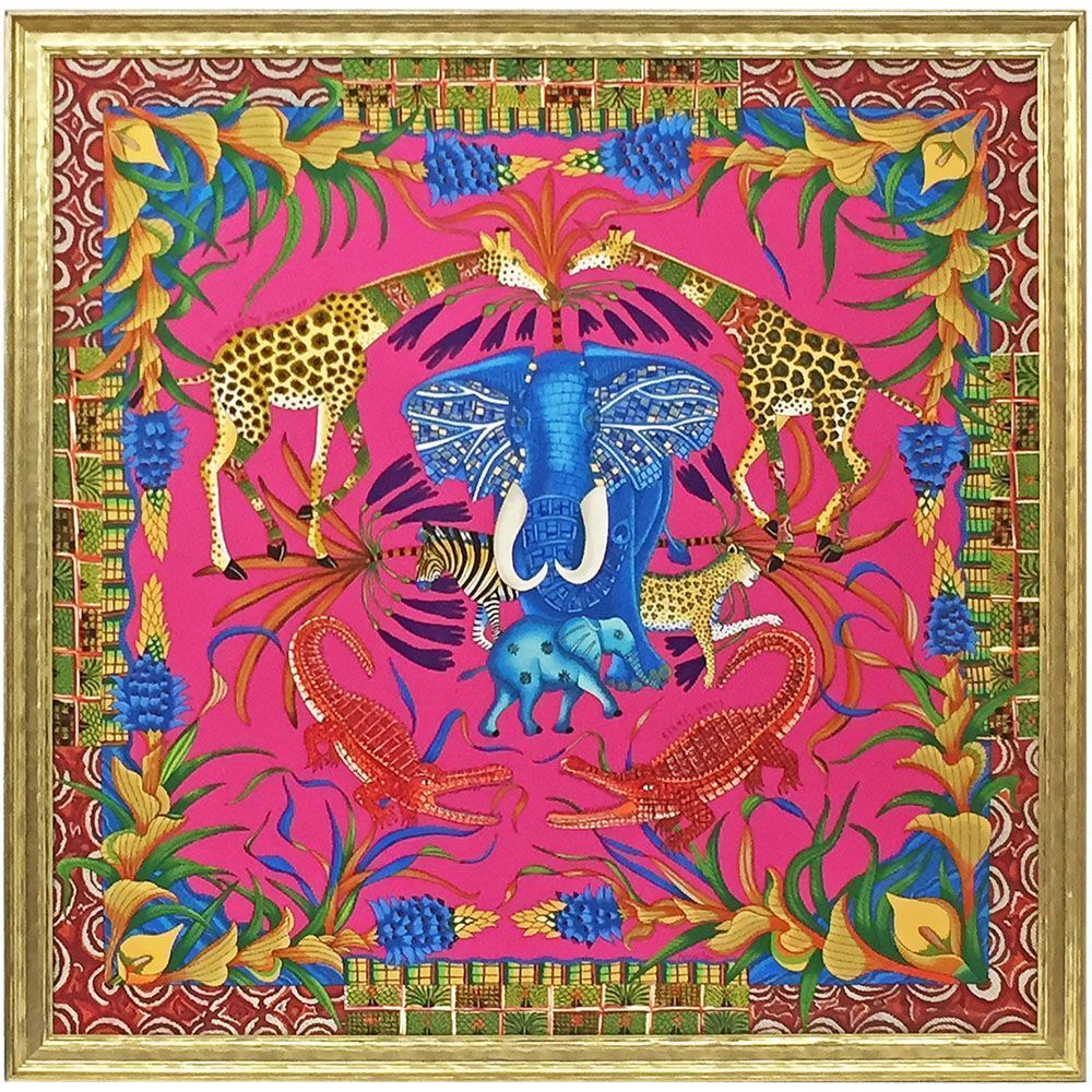 「la marche du zambeze」、ザンベジ川の行進と名づけられたスカーフの額装です。メタリックな強い光沢が特徴の「26-6087」を選択しました。インパクト抜群の額縁ですが、カラフルに彩られたスカーフも負けていません。額縁と中身がそれぞれを高め合う、素晴らしい額装になりました。