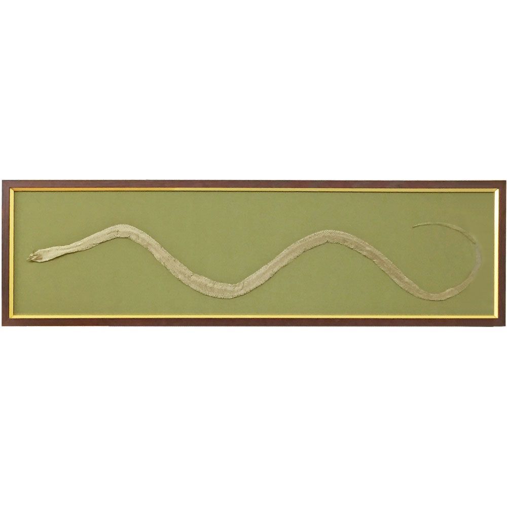 全長1.8mほどでしょうか。頭からの全身が見事に揃った、縁起物のヘビの抜け殻の額装です。和室の襖の上に飾られるとのことでした。和室の上に細長い欄間額が飾られるように、横長にレイアウトした抜け殻はバランスよく納まることでしょう。