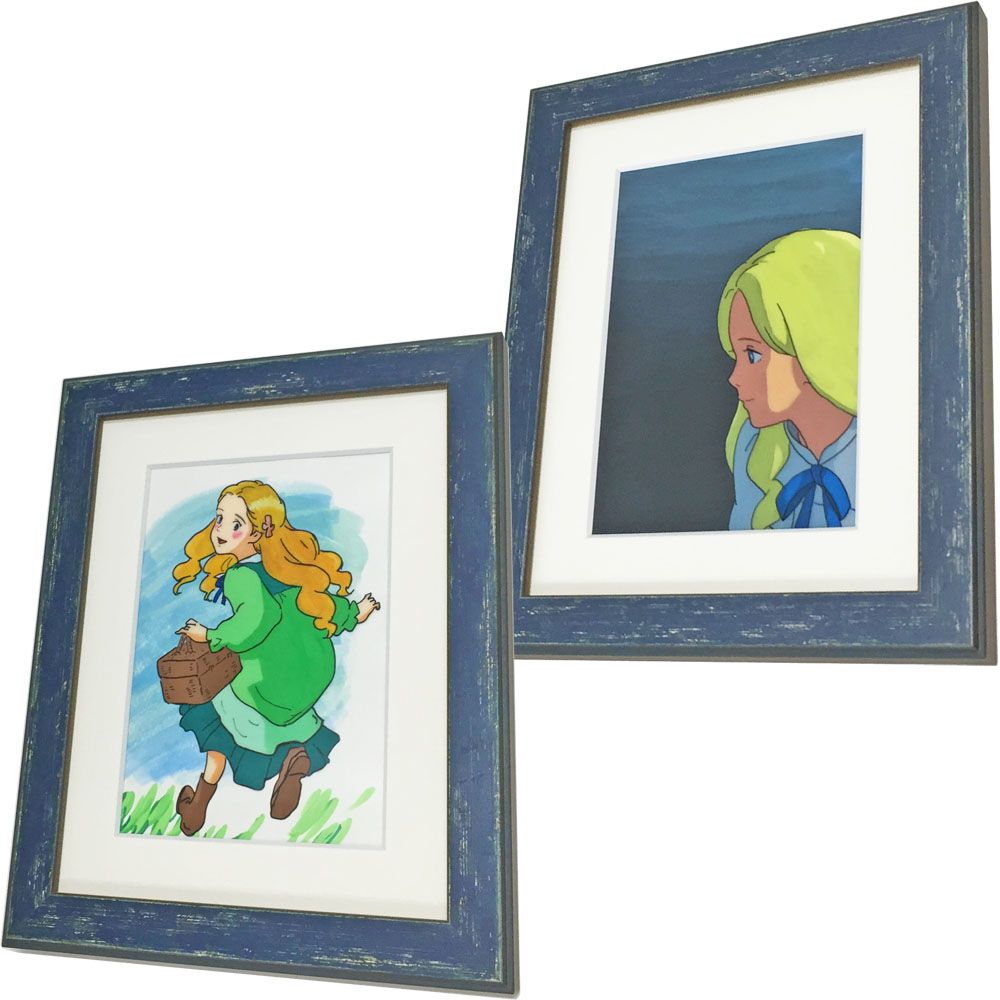 セルと画用紙が重なって一つの作品になっていますが、額装に際しては、1枚物とほとんど変わりません。オーソドックスに紙マットを組み合わせた額装としました。アンティーク調のブルーフレームで、作品のイメージを再現しました。
