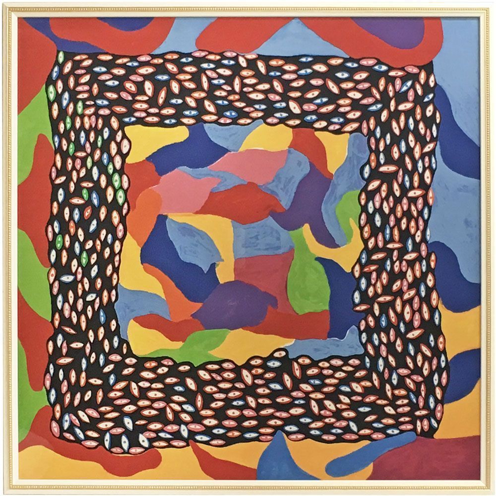 草間彌生さんが手がける絵画シリーズ、「わが永遠の魂」の一作品をモチーフにしたスカーフの額装。2009年から制作が開始された「わが永遠の魂」の連作群、そのほとんどが正方形ということもあり、スカーフのモチーフとしてもぴったりです。2017年2月22日から5月22日まで開催された、国立新美術館での展覧会で求めたものでしょうか。実際の作品はS120号(194.0×194.0cm)が多いようですが、こちらのスカーフは90cm角になっています。