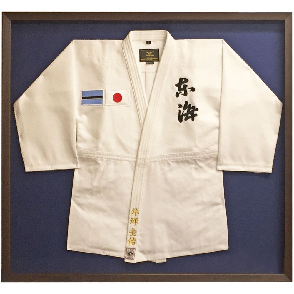 井坪圭佑さんの名前入り柔道着の額装です。井坪さんは2020年の東京五輪にボツワナ代表を出場させる夢を抱き、アフリカ南部ボツワナで柔道普及に尽力していましたが、不慮の事故により逝去されました。氏の活動はボツワナの若者たちに受け継がれていることでしょう。
