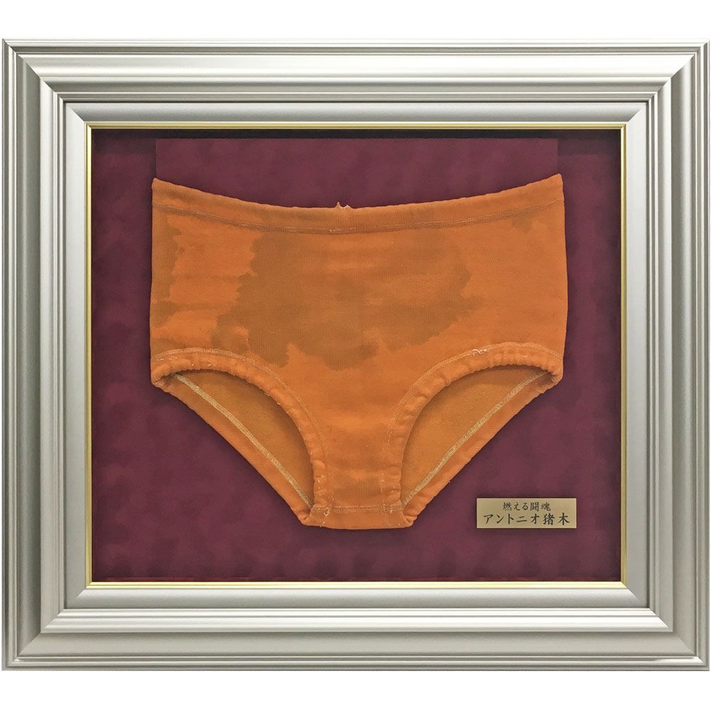 アントニオ猪木が使用したレスラーパンツの額装です。パンツを履かせた型紙を留めることで、パンツ自体にはダメージがないように配慮しました。腰周りに型紙が飛び出す形になっていますが、背景色と同色のマットで作った型紙なので違和感もありません。