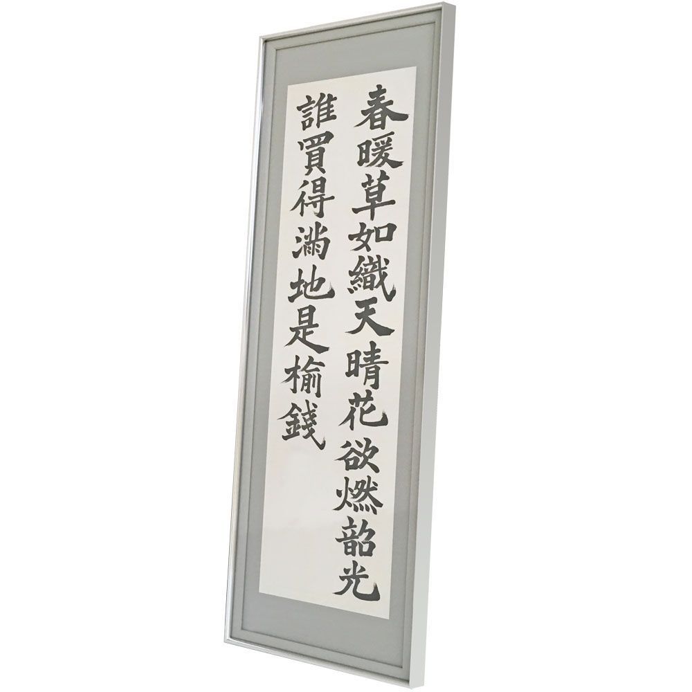 書道作品の額装方法は大きく3パターンに分かれます。一つ目は窓抜きしたマットを作品に被せる方法。二つ目は背景となる布地の上に作品を乗せる方法。三つ目は浮かし額装などの少し変わった方法です。こちらの額装例は、二つ目に該当します。
