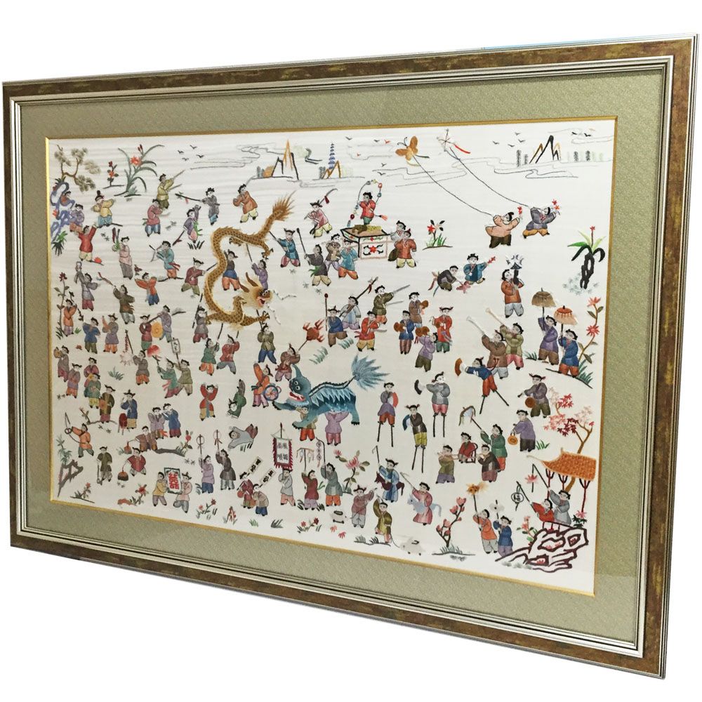 30年以上前に中国上海で購入した刺繍絵画。シルク地に刺繍された、お祭りの風景です。作品の性質上、ベースとなるシルク地に皺やたるみが見られます。作品の周囲を飾る柄物の布地を取り外してから、シルク地を裏打ちして皺やたるみを正しました。
