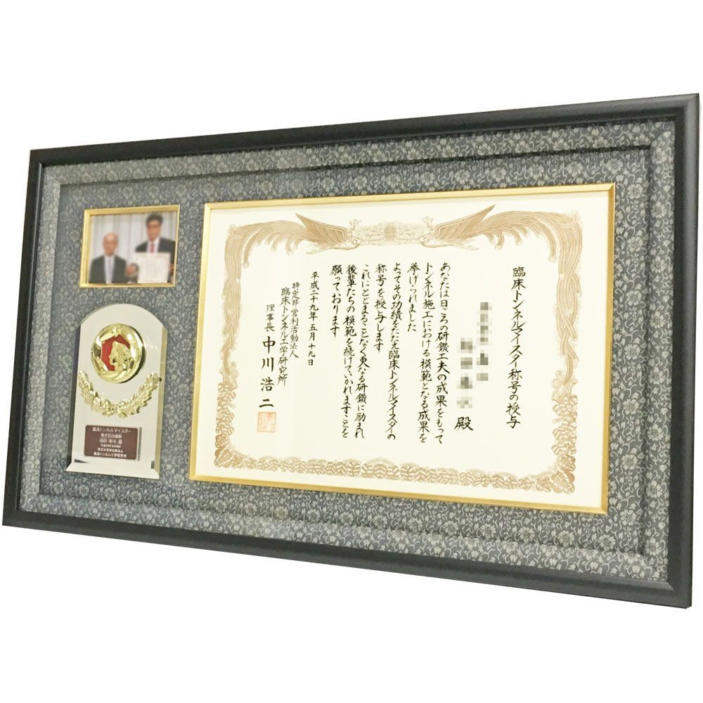 美しい鏡面の盾が目を引く額装です。トンネル専門工事業に携わる技術者の方に授与される、臨床トンネルマイスターの称号が刻まれた表彰盾。盾の後ろにあるスタンド部分をはめ込んで額縁に固定しました。